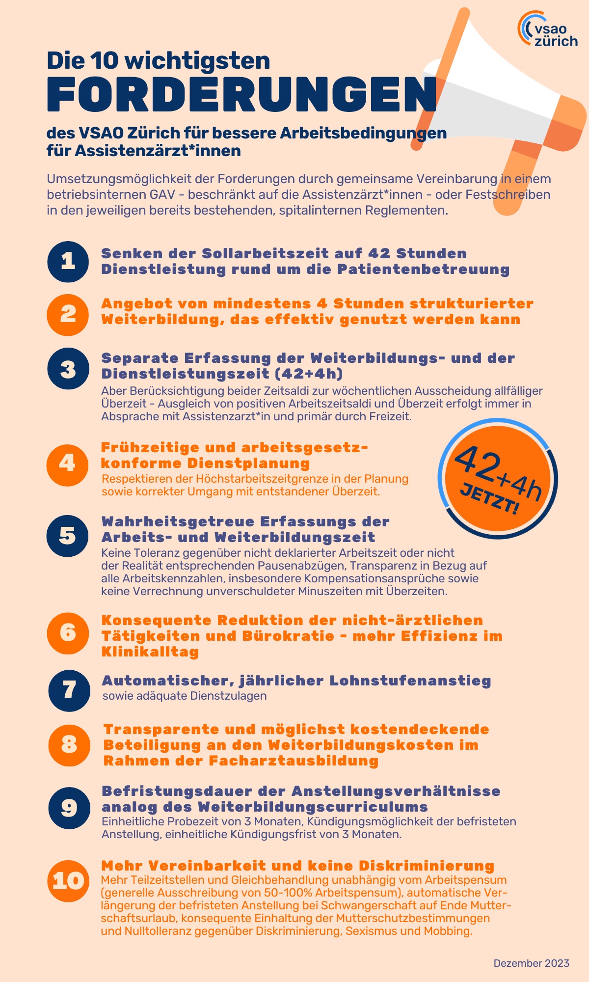 Nachdem der VSAO Zürich den GAV mit den kantonalen Spitälern auf Ende 2023 gekündigt hat, konnte im Verlaufe des 2024 mit allen vier kantonalen Kliniken (USZ, KSW, IPW & PUK) eine Einigung zur Arbeitszeitsenkung für Assistenzärzt:innen gefunden werden. Mehr Informationen zur 42+4h-Woche sowie diverses Informationsmaterial und Gadgets dazu findest Du hier als auch beim vsao Schweiz.